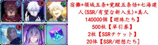 総計リソース数28万+影宿儺+領域五条+覚醒五条悟+高専七海+託された一命+夜真人+SSRチケット2¥9,600 -