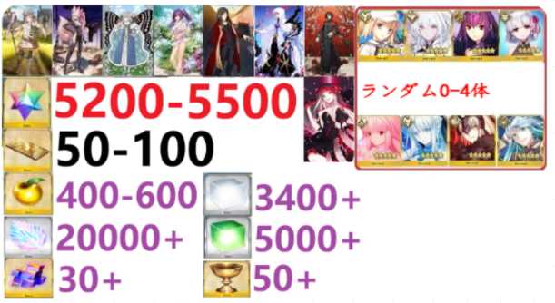 【画像の所持】聖晶石5200-5500個+呼符50-100個+果実400-600個+その他¥1,800 -